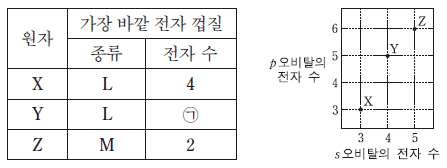표는 원자 X~Z의 가장 바깥 전자 껍질의 종류와 전자 수를 그림은 X~Z의 s와 p오비탈에 들어 있는 전자 수를 나타낸 것이다.