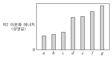 그림은 원자 a~g의 제2 이온화 에너지를 나타낸 것이다. a~g의 원자 번호는 각각 8~14중 하나이다.