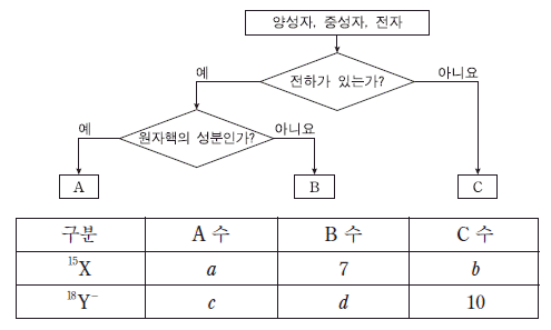 그림은 원자의 구성 입자인 양성자, 중성자, 전자를 A~C로 분류한 것이고, 표는 원자15X와 이온 18Y-에 대한 자료이다.