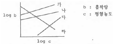 [수질오염방지기술] 농도와 흡착량과의 관계를 나타내는 그림 중 고농도에서 흡착량이 커지는 반면에 저농도에서의 흡착량이 현저히 적어지는 것은? (단, Freundlich 등온흡착식으로 Plot한 것임)