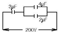 그림과 같은 콘덴서의 직·병렬회로에 200V의 전압을 인가했을 때 4μF 콘덴서 양단의 전압은 몇 V 인가?