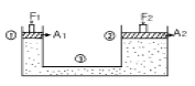 그림에서 피스톤 ①의 단면적 A1=5cm2, ②의 단면적 A2=50cm2 일 때, F1 에 5㎏f의 힘을 가할때 F2는 몇 ㎏f의 힘을 가해야 균형되는가?