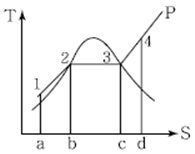 그림의 압력 P에서 물 1 kg이 압축액 1의 상태로부터 과열증기 4의 상태까지 가열되고 있다. 흡수한 전체 열량 중 과열에 소요된 열량을 표시하는 면적을 옳게 나타낸 것은?