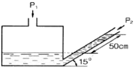 다음 그림과 같은 경사관식 압력계에서 P2는 50kg/m2일 때 측정압력 P1은 약 몇 kg/m2인가? (단, 액체의 비중은 1이다.)
