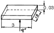 그림과 같이 가로×세로×높이가 3×1.5×0.03m 인 탄소 강판이 놓여 있다. 열전도계(K)가 43W/mㆍK이며, 표면온도는 20℃였다. 이 때 탄소강판 아래 면에 열유속(q“=q/A) 600kcal/m2ㆍh을 가할 경우, 탄소강판에 대한 표면온도 상승[△T(℃)]은?