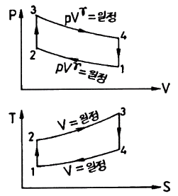 그림과 같이 작동하는 열기관 사이클(cycle)은? (단, γ는 비열비이고, P는 압력, V는 체적, T는 온도, S는 엔트로피이다.)