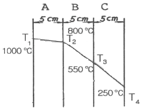 서로 다른 고체 물질 A, B, C인 3개의 평판이 서로 밀착되어 복합체를 이루고 있다. 정상 상태에서의 온도 분포가 그림과 같을 때, 어느 물질의 열전도도가 가장 작은가? (단, 온도 T1=1000℃, T2=800℃, T3=550℃, T4=250℃ 이다.)