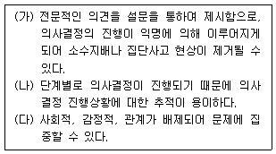 [유통경영] 박스 안의 (가), (나), (다)는 집단의사결정에 활용되는 어느 기법의 특징과 장점을 설명한 것이다. 어느 것에 대한 설명인가?