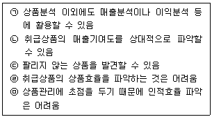 [유통경영] 아래 글상자는 유통점포의 상품관리에 활용되는 ABC 분석에 대한 설명이다. 옳은 설명으로 짝지어진 것은?