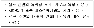 [상권분석] 아래 글상자에서 괄호 안에 들어갈 입지조건을 평가하는 항목을 순서대로 나열한 것으로 가장 옳은 것은?