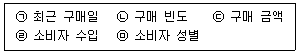 오늘날 유통업체에서는 고객정보분석을 위해서 RFM 분석을 수행하고 있다. 아래 글상자에서 RFM 분석에 대한 특성을 나열한 것으로 옳은 것은?