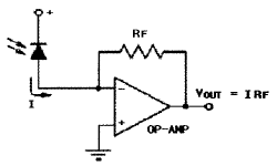 다음의 센서는 빛이 들어오지 않았을 때는 OA의 전류(I)가 발생하고, 10mW/cm2의 빛이 들어왔을 때는 0.5㎂의 전류가 발생한다. RF = 10kΩ일때. 10mW/cm2의 빛이 센서에 가해졌다면 출력전압은?