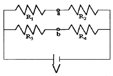 그림과 같은 회로에서 단자 a와 b사이의 전위차는? (단, R1=2Ω, R2=1Ω, R3=2Ω, R4=2Ω이며, 전압은 12V 이다.)