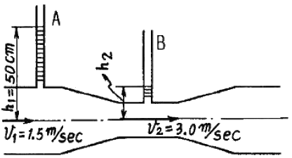 [기계유체역학] 그림과 같은 관에 유리관 A, B를 세우고 물을 흐르게 했을 때 유리관 B의 상승높이 h2는 약 몇 cm인가?