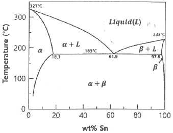 [비파괴검사 개론] 다음 Pb-Sn 합금 상태도에 대한 설명으로 틀린 것은?