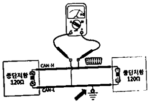 배터리가 탈거된 상태에서 그림과 같이 CAN 통신라인을 점검할 때 화살표 부분이 차체와 접지되었다면 측정되는 저항값은?