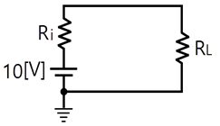 다음 회로에서 부하 RL에 최대 전력이 공급될 때의 전력값이 5[W]라고 할 때 RL+Ri의 값은 몇 [Ω]인가? (단, Ri는 전원의 내부저항이다.)