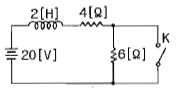 다음과 같은 회로에서 스위치 K가 닫힌 상태에서 회로에 정상전류가 흐르고 있다. t = 0에서 스위치 K를 열 때 회로에 흐르는 전류[A]는?