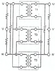 다음 그림은 단상 변압기 결선도이다. 1,2차는 각각 어떤 결선인가?