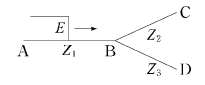 임피던스 Z1, Z2 및 Z3 을 그림과 같이 접속한 선로의 A쪽에서 전압파 E가 진행해 왔을 때 접속점 B에서 무반사로 되기 위한 조건은?