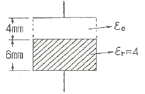 한 변의 길이가 500[mm]인 정사각형 평행 평판 2장이 10[mm] 간격으로 놓여 있고 다음과 같이 유전율이 다른 2개의 유전체로 채워진 경우 합성용량은 약 몇 [pF]인가?