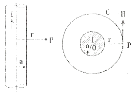그림에서 I[A]의 전류가 반지름 a[m]의 무한히 긴 원도도체를 축에 대하여 대칭으로 흐를 때 원주외부의 자계 H를 구한 값은?