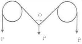 그림과 같이 두 개의 활차를 사용하여 물체를 매달 때 3개의 물체가 평형을 이루기 위한 θ값은? (단, 로프와 활차의 마찰은 무시한다.)