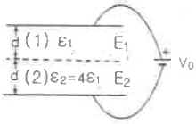 평행판 콘덴서의 극판 사이에 유전율이 각각 ε1, ε2 인 두 유전체를 반씩 채우고 극판 사이에 일정한 전압을 걸어줄 때 매질 (1), (2) 내의 전계의 세기 E1, E2 사이에 성립하는 관계로 옳은 것은?