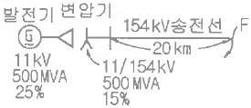 그림의 F점에서 3상 단락고장이 생겼다. 발전기 쪽에서 본 3상 단락전류는 몇 kA 가 되는가? (단, 154 kV 송전선의 리액턴스는 1000 MVA 를 기준으로 하여 2 %/km 이다.)