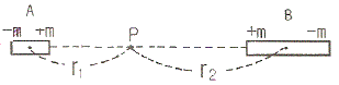두 개의 소자석 A, B의 세기가 서로 같고 길이의 비는 1:2이다. 그림과 같이 두 자석을 일직선상에 놓고 그 사이에 A, B의 중심으로부터 r1, r2 거리에 있는 점 P에 작은 자침을 놓았을 때 자침이 지석의 영향을 받지 않았다고 한다. r1: r2는 얼마인가?