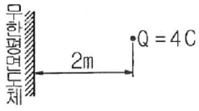 그림과 같이 공기 중에서 무한평면도체의 표면으로부터 2m인 곳에 점전하 4C이 있다. 전하가 받는 힘은 몇 N 인가?