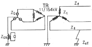 그림과 같은 전력계통의 154kV 송전선로에서 고장 지락 임피던스 Zgf를 통해서 1선 지락 고장이 발생되었을 때 고장점에서 본 영상 %임피던스는? (단, 그림에 표시한 임피던스는 모두 동일용량, 100MVA 기준으로 환산한 %임피던스임)