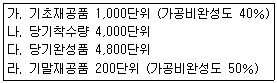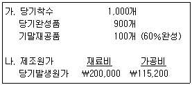 다음은 종합원가계산시스템을 채택하고 있는 어느 한 부문의 자료 이다. 재료비는 공정초기에 모두 발생하며, 가공비는 공정전체 에서 균일하게 발생한다. 평균법에 의하여 재료비와 가공비의 완성품환산량을 계산하면 얼마인가?
