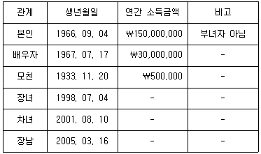 다음은 거주자 A씨와 배우자 및 생계를 같이하는 부양가족의 현황이다. A씨의 2015년도 종합소득공제 중 인적공제액을 계산하면 얼마인가? (단, 부양가족은 별도의 소득이 없다.)