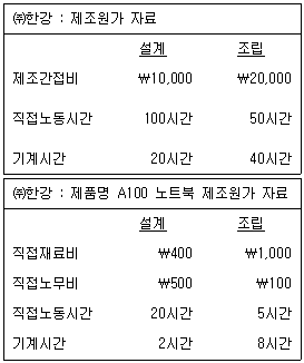 (주)한강은 맞춤형 노트북을 생산하고 있다. 회사는 설계부문과 조립부문으로 제조과정이 구성되며 해당 부문의 제조원가 자료가 다음과 같다. 회사가 생산한 노트북 중 제품명 A100의 제조원가 자료가 다음과 같을 때, 공장전체 제조간접비배부율(직접노동시간기준)과 부문별 제조간접비배부율(설계부문은 직접노동시간기준, 조립 부문은 기계시간기준)에 의한 제품원가는 각각 얼마인가?