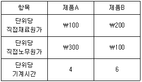 (주)한국은 제품 A와 제품 B를 각각 100개씩 생산하며, 회사 전체의 고정제조간접원가가 ₩50,000이 발생하였다. 고정제조 간접원가의 배부기준은 기계시간으로 한다. 다음 표를 통해 제품 A의 단위당 원가를 계산하라.