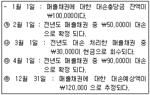 2016년도에 (주)전산의 매출채권과 대손충당금에 대하여 다음과 같은 사건 또는 거래가 발생하였다. 이러한 사건 또는 거래에 대한 분개가 잘못된 것은? 다만 보고기간말은 12월말로 가정하고 매출채권의 자산손상 회계처리는 충당금설정법을 사용하고 있다.