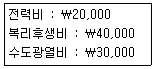공장제조간접원가의 발생액이 다음과 같다. 이 중 전력비를 제외하고는 이미 현금으로 지급하였다. 관련 분개를 수행했을 경우에 대변에 기입되는 사항만 바르게 제시한 것은 다음 중 어느 것인가? (단위 : 원)