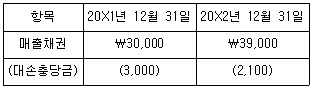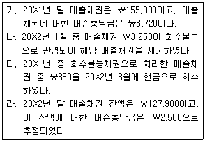 다음은 20X1년 말 재무상태표에 보고된 매출채권에 대한 대손충당금과 20X2년 중의 거래내용이다. 다음의 자료를 이용하여 회계처리할 경우 20X2년도의 당기순이익은 얼마나 감소하겠는가?