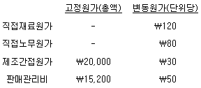 [원가관리회계] 제품 단위당 판매가격은 ₩500이며, 매출량은 200개이다. 당기 중에 발생한 제조원가 및 판매관리비는 다음과 같다. 옳지 않은 것은?
