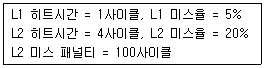 반면에 2계층 캐시 메모리를 사용한다면, L1 캐시와 L2 캐시에서 데이터를 가져오는 경우가 더 많아지므로 평균 메모리 액세스 시간이 감소한다. 이 경우 평균 메모리 액세스 시간은 다음과 같다.