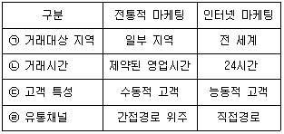 [전자상거래 일반] 다음 중 전통적 마케팅과 인터넷 마케팅을 비교한 내용으로 가장 올바른 것으로만 짝지어진 것은?