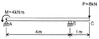 [조경시공구조학] 그림과 같은 내민보의 점A에 모멘트가, 점C에 집중하중이 작용한다. 지점 A에서 3m떨어진 단면에 작용하는 전단력의 크기는 몇 kN인가?