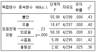 - ① Wilks'λ 값을 보면 또래관계 유형 간 심리적 특성의 차이가 있다.