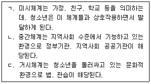 브론펜브레너(U. Bronfenbrenner)의 생태학적 이론에서 청소년 환경체계에 관한 설명으로 옳은 것을 모두 고른 것은?