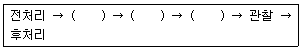건식현상제를 사용하는 용제제거성 형광침투탐상검사의 탐상순서가 다음과 같을 때 괄호 안의 순서는?