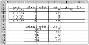 [B2:G7] 셀 영역의 상품코드, 상품명, 단가를 참조하여 [F3]에 함수를 사용하여 단가를 입력하고, 나머지 단가 [F4:F7]를 채우기 핸들로 끌어 계산하고자 한다. [F3] 셀에 들어갈 적절한 함수식은?