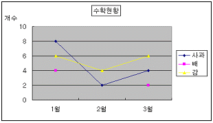 아래 차트와 같이 ‘배’의 꺾은선 중간(2월) 부분이 단절되어 있는 이유로 적당한 것은?