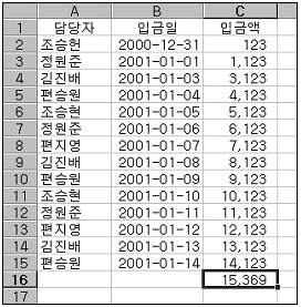 담당자 조승현의 입금액 합계를 [C16] 셀에 구한 것이다. 다음 중 [C16] 셀에 들어갈 함수식으로 옳은 것은?