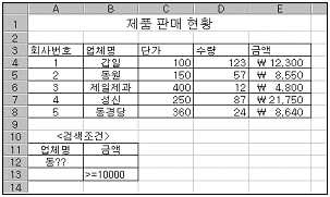 다음은 고급필터의 기능을 나타낸 것이다. <검색조건>에 대한 설명으로 옳은 것은?
